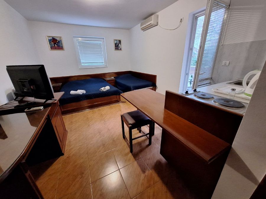 Studio:Opremljeni su francuskim i odvojenim krevetom, kupatilom (TWC), fenom, TV-om, klima-uređajem, besplatnim Wi-Fi internetom i mini čajnom kuhinjom za pripremu lakih obroka sa mini-frižiderom.