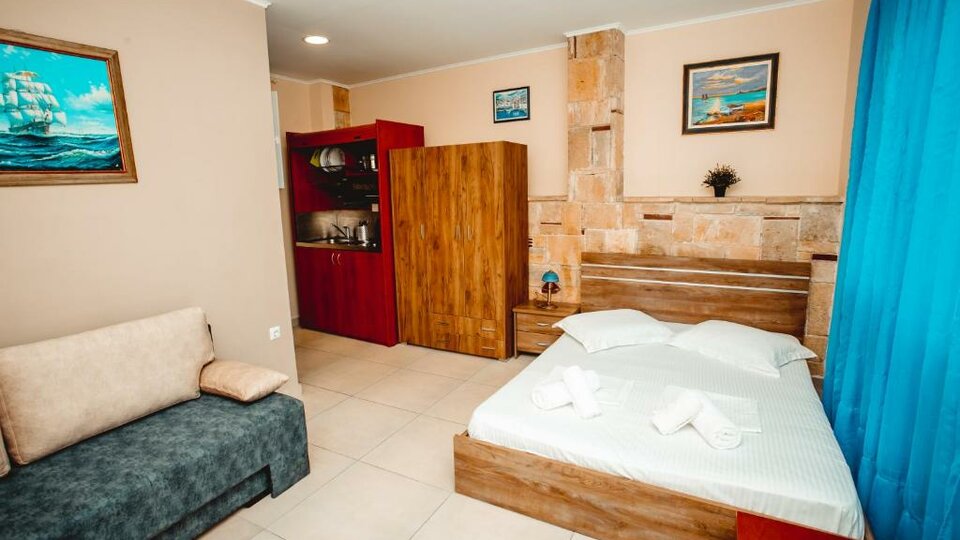 Aneks studio pogled dvorište - smeštajne jedinice veličine oko 25m2 nalaze se u aneks delu objekta, u prizemlju. U jednoj prostoriji se nalaze francuski ležaj i sofa sa mini kuhinjom. Maksimalni broj osoba u sobi su četiri ali nije dozvoljena kombinacija 3 odrasle + 1 dete.