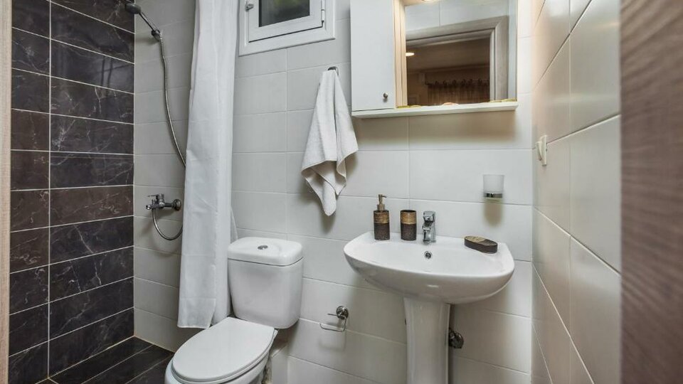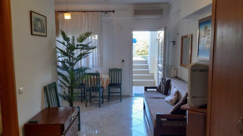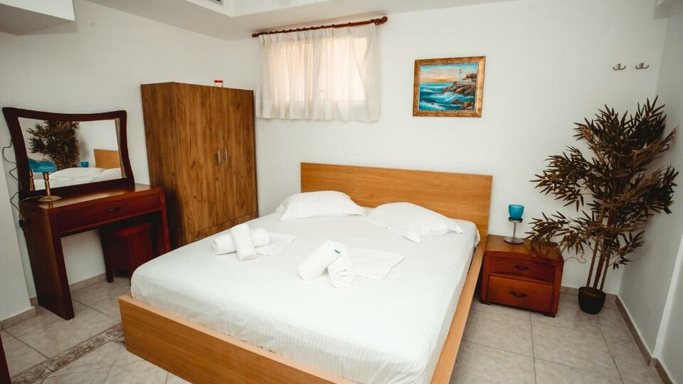Apartman pogled more - smeštajne jedinice veličine oko 44m2 nalaze se na prvom i drugom spratu glavne zgrade sa francuskim ležajem u spavaćoj sobi i dve sofe u dnevnom boravku.Poseduju i mini kuhinju. Maksimalni broj osoba u sobi su pet.