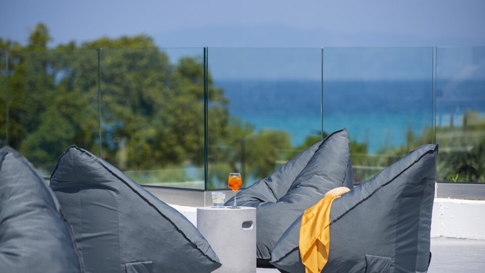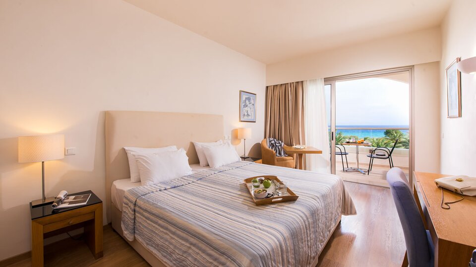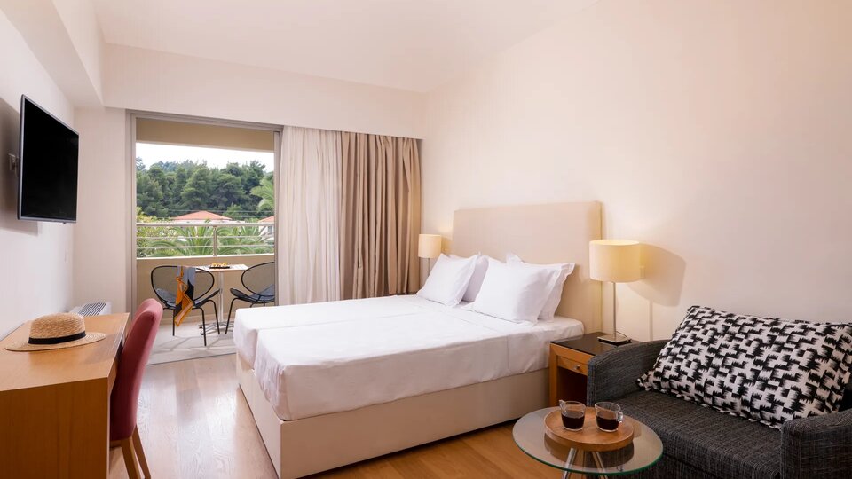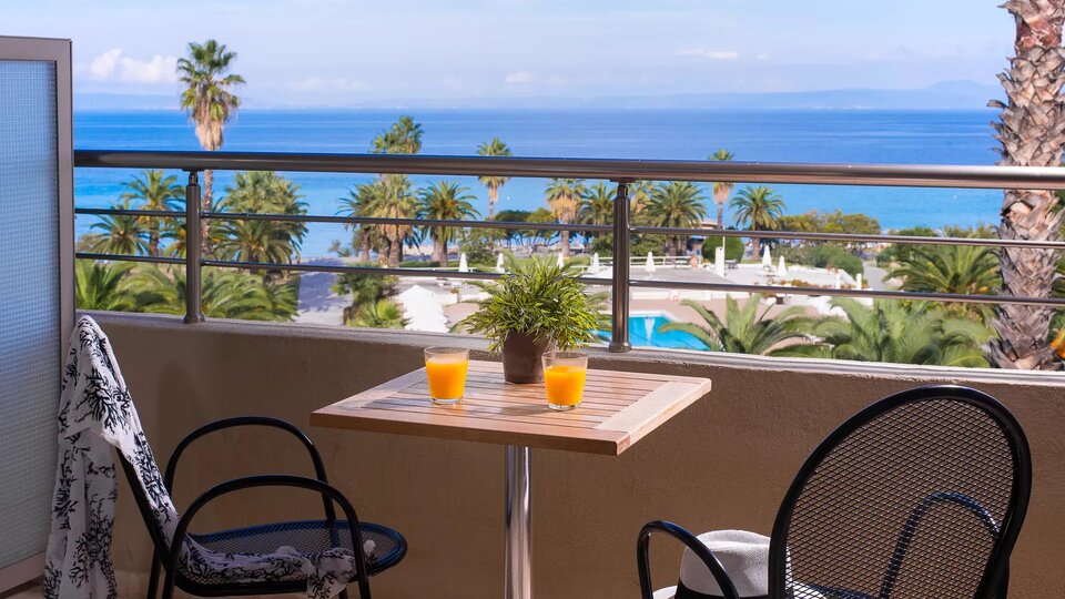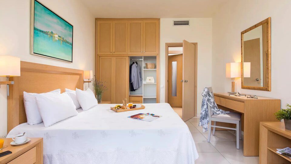 Suite pogled more (One Bedroom Suite Sea view)- Nalaze se u centralnom delu kompleksa, blizu bazena. Renovirani su 2025.godine. Imaju odvojenu spavaću sobu sa francuskim ležajem i dnevni boravak sa jednom ili dve sofe. Mogu smestiti maximum 4 odrasle osobe ili dve odrasle osobe i dvoje dece. Kapacitet sobe: Max 4 osobe (Odrasli: Max 4 , Deca: Max 2)