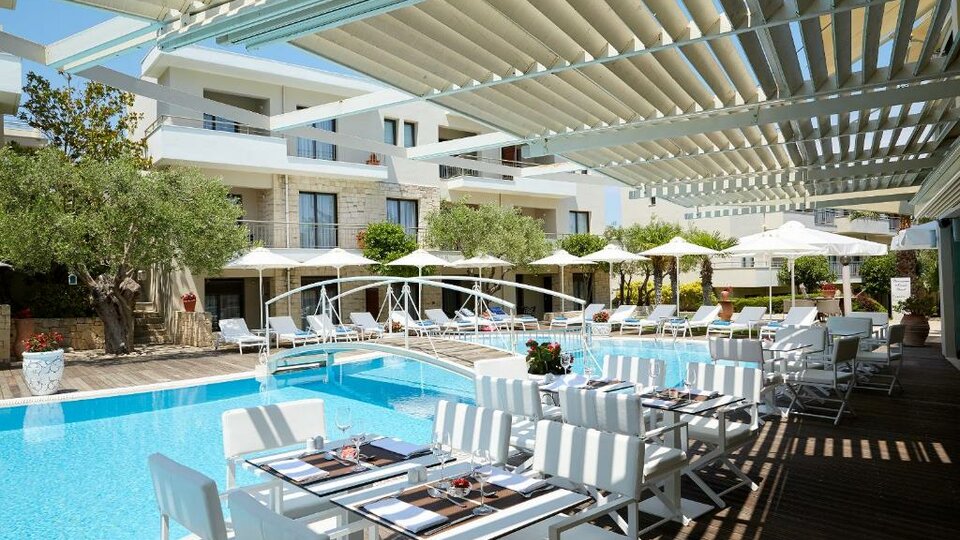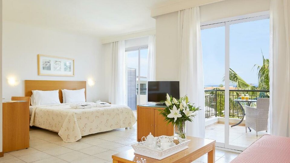 Suite – Prostrane smeštajne jedinice ( oko 45m2) klasičnog stila sa prijatnim pastelnim bojama. Poseduju spavaću sobu sa dva ležaja ( ili jednim francuskim) a u dnevnom boravku se nalazi najčešće sofa. Terase gledaju na baštu ili bazen. Maksimalni broj osoba u sobi je do tri. Kapacitet sobe: Max 3 osobe ( Odrasli: Max 3 , Deca: Max 1 )