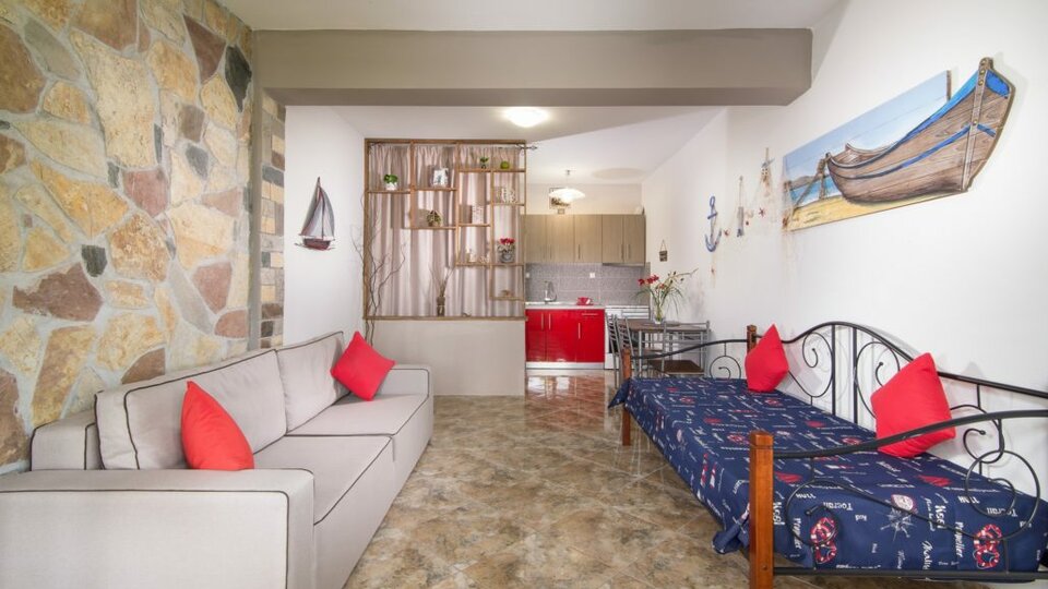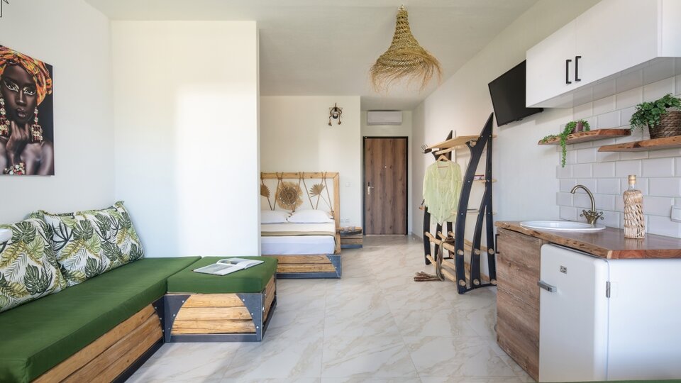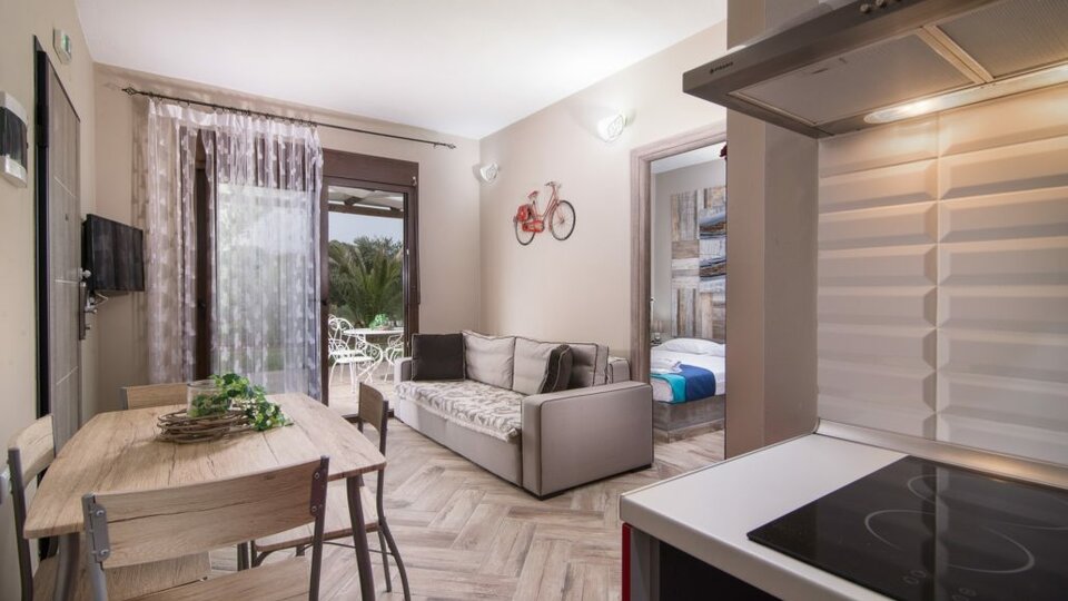 Apartman (one bedroom apartment) - smeštajne jedinice površine oko 35m2. U dnevnom boravku je sofa kao i mini kuhinja a u spavaćoj sobi jedan francuski ležaj.Obično imaju verandu umesto terase. Maksimalni broj osoba u sobi su četiri.