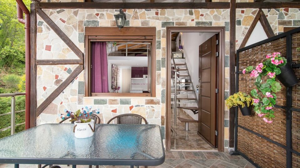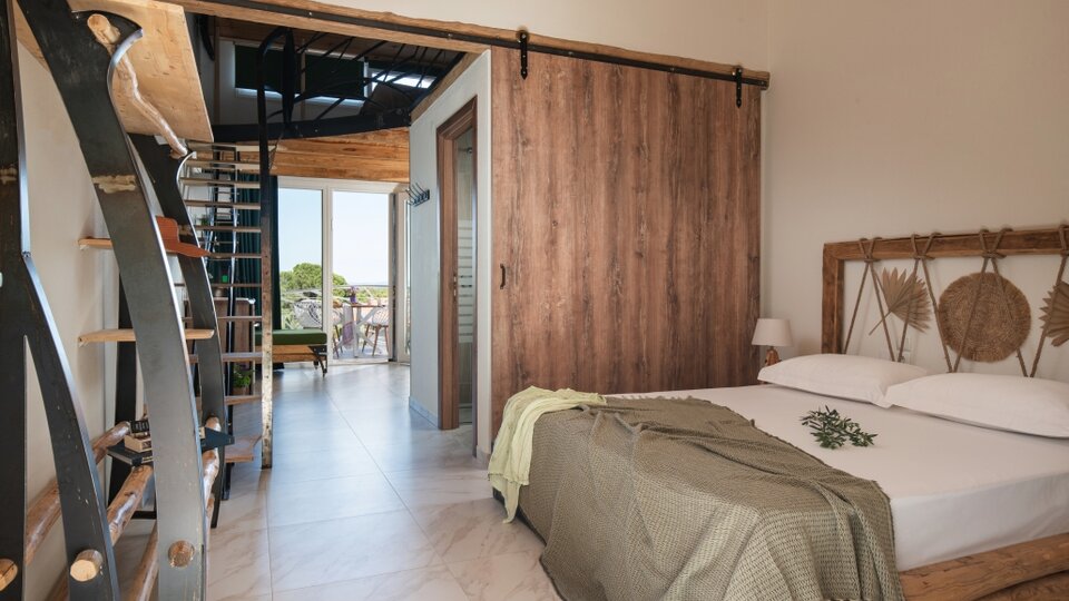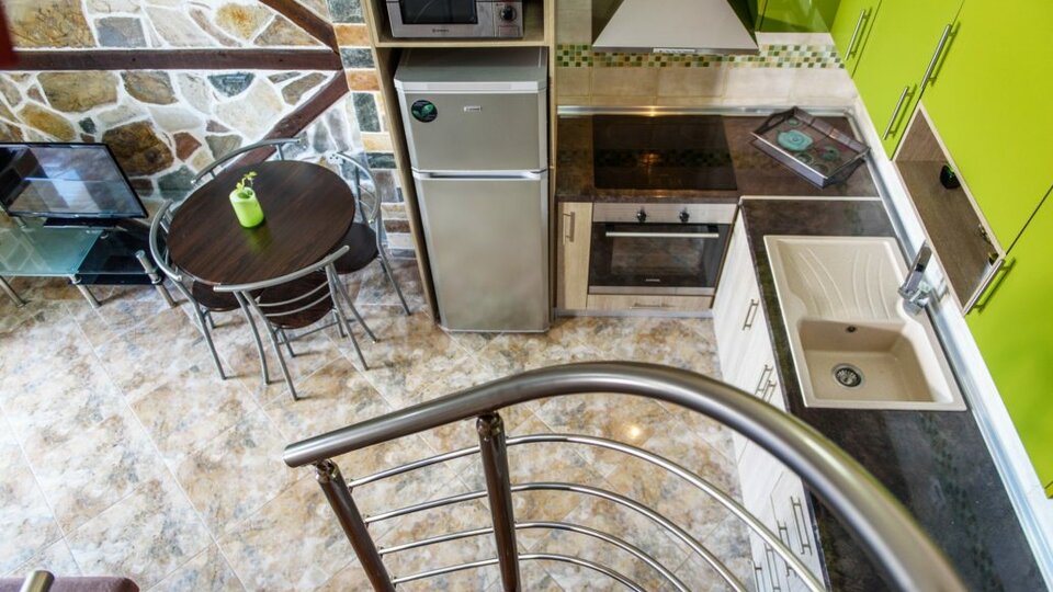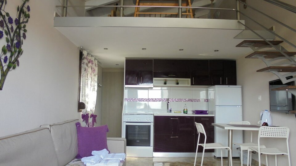 Duplex apartman - smeštajne jedinice sa potkrovljem. U donjem delu je jedna sofa, mini kuhinja i kupatilo. U potkrovlju je još jedan francuski ležaj. Sa verande se pruža pogled na dvorište. Maksimalni broj osoba u sobi su četiri. Kapacitet sobe: Max 4 osobe ( Odrasli: Max 3 , Deca: Max 2 )