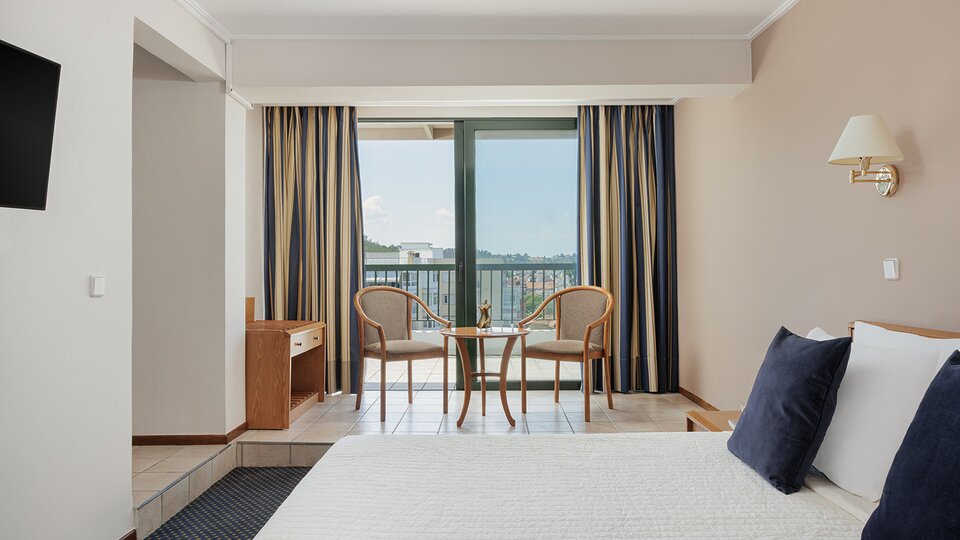 Deluxe soba bočni pogled more – smeštajne jedinice površine oko 25 m² sa francuskim ležajem ili dva odvojena kreveta i pomoćnim ležajem za treću osobu. U nekim sobama dozvoljeno je da drugo dete do 5,99 godina deli ležaj sa roditeljima. Maksimalni broj osoba u sobi je do tri. Kapacitet sobe: Max 3 osobe ( Odrasli: Max 3 , Deca: Max 1, Beba: Max 1 )