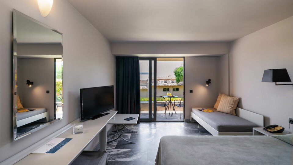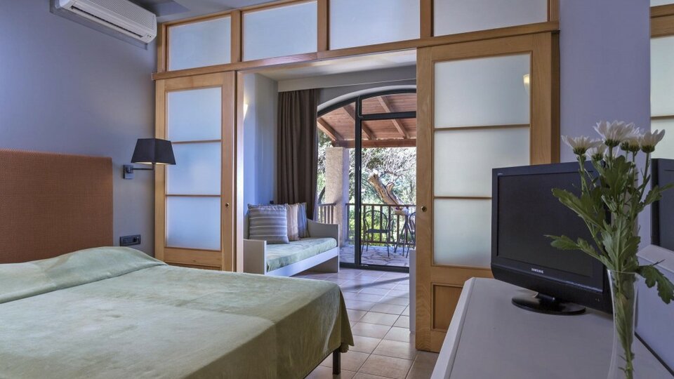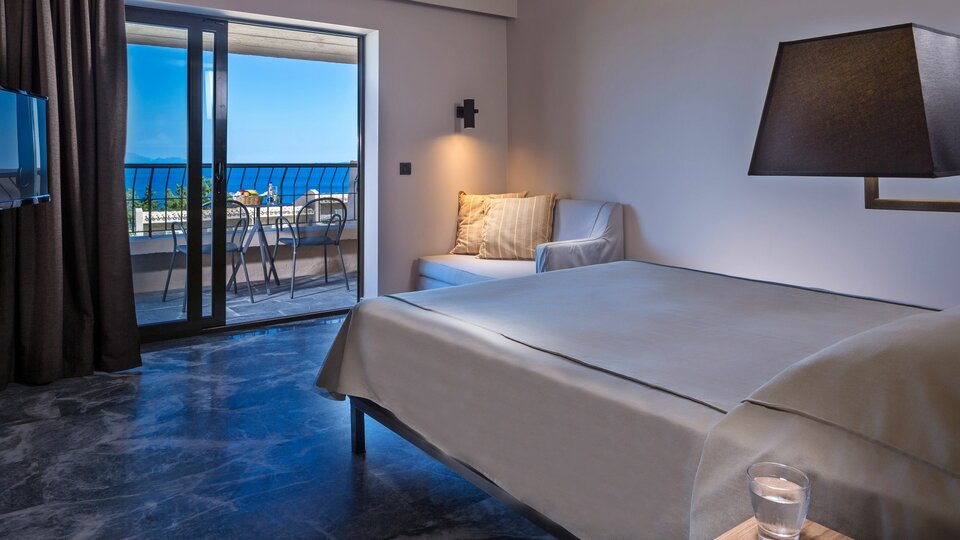 Deluxe soba pogled more - renovirane smeštajne jedinice površine oko 25 m² sa francuskim ležajem ili dva osnovna ležaja i sofom. Sofa je namenjena za smeštaj jedne odrasle osobe ili jednog deteta uzrasta do 11.99 god. Ovaj tip smeštajnih jedinica nalazi se u centralnoj zgradi ili bungalovima. Maksimalni broj osoba u sobi je do tri.