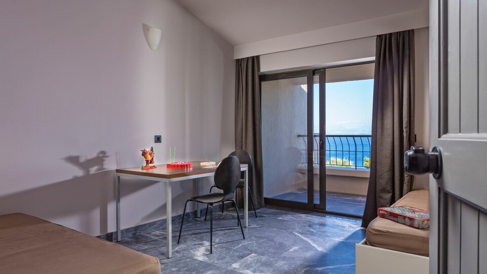 Porodična soba pogled more - smeštajna jedinica površine oko 45 m² koja se sastoji iz dve prostorije . U jednoj prostoriji se nalazi francuski ležaj ili dva osnovna ležaja, a u drugoj dve sofe . Svaka sofa je namenjena za smeštaj jedne odrasle osobe ili jednog deteta uzrasta do 11.99 god. Ovaj tip smeštajnih jedinica ima pogled na more. Maksimalni broj osoba u sobi je do četiri.
