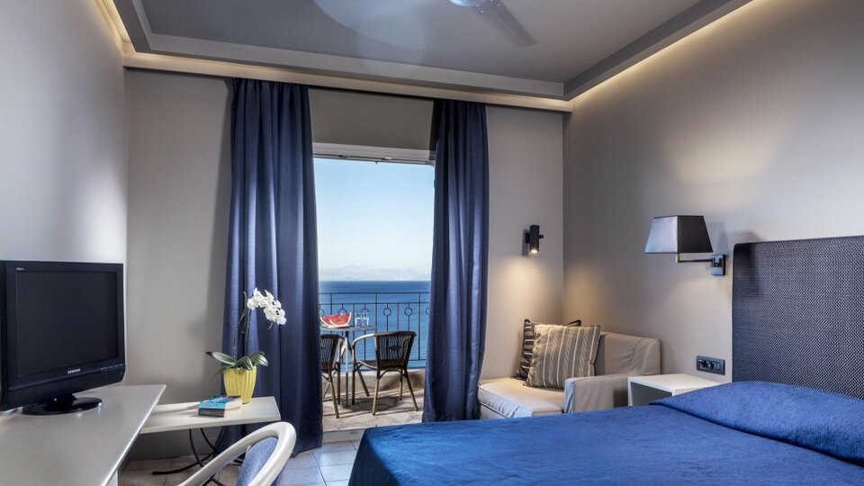 Standard soba pogled more - smeštajne jedinice površine oko 21 m² sa francuskim ležajem ili dva osnovna ležaja. Ovaj tip smeštajnih jedinica nalazi se u centralnoj zgradi i u zavisosti od pozicije imaju pogled na more ili bočni pogled na more. Maksimalni broj osoba u sobi su dve.