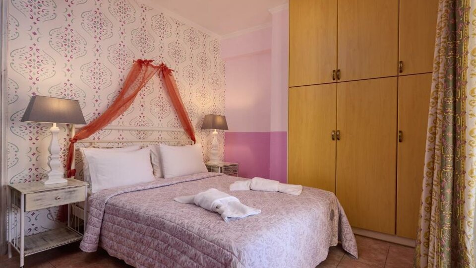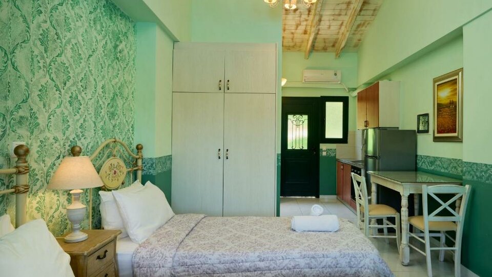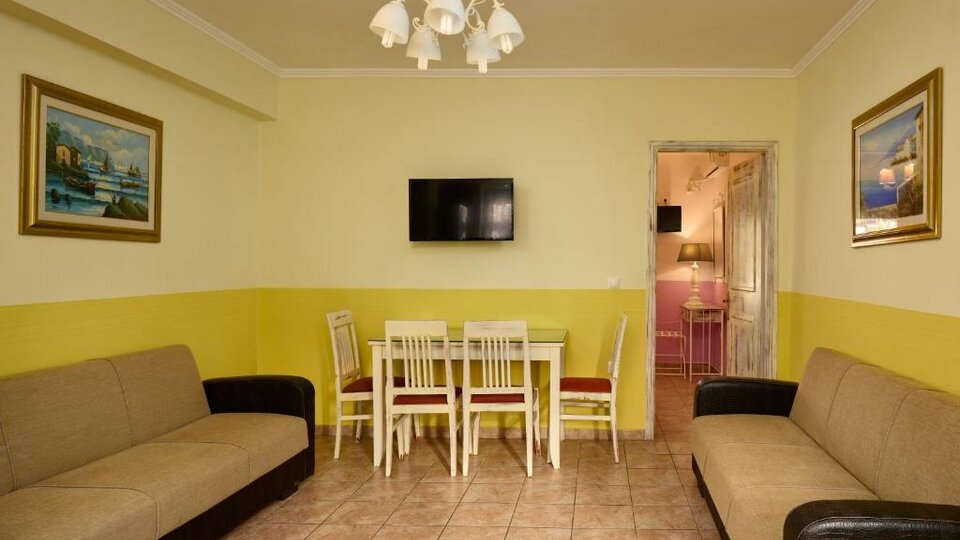 Apartman - smeštajne jedinice sa francuskim ležajem u spavaćoj sobi i dve sofe u dnevnom boravku . Imaju mini kuhinju i verandu sa pogledom na dvorište ili bazen. Maksimalni broj osoba u sobi su pet.