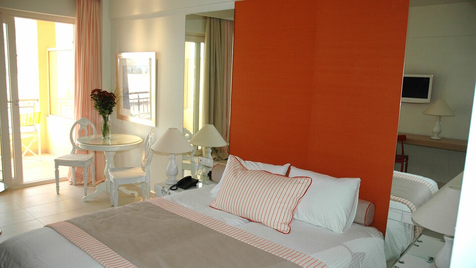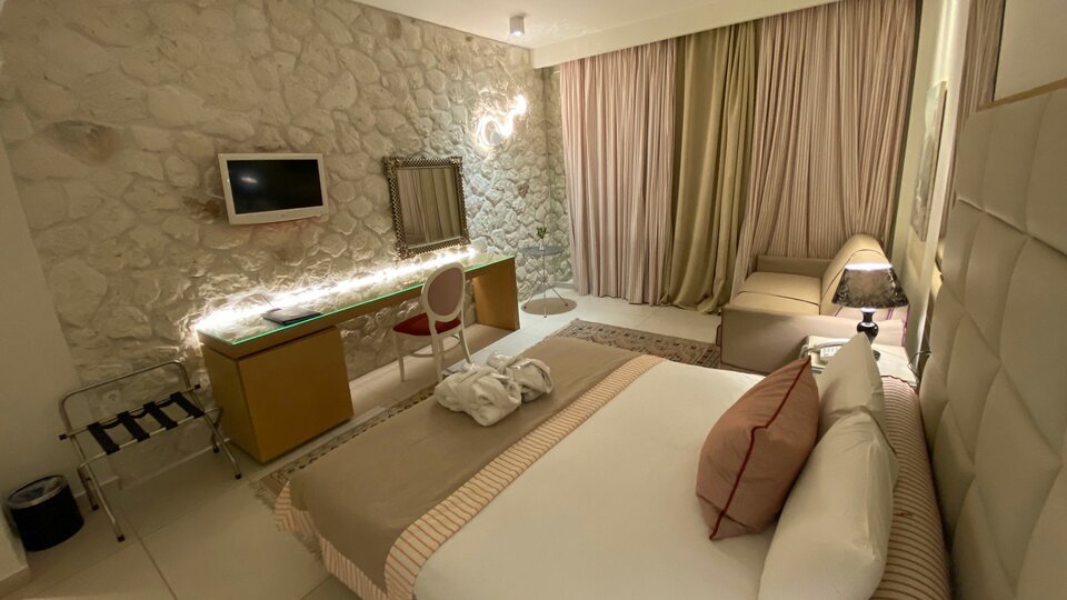 Deluxe soba pogled more - smeštajne jedinice površine oko 24m², strukture francuski ležaj ili dva osnovna ležaja sa pomoćnim ležajem (najčešće sofa) namenjenim za smeštaj jedne odrasle osobe ili dva deteta uzrasta do 11.99 god. Maksimalni broj osoba u sobi je do četiri.