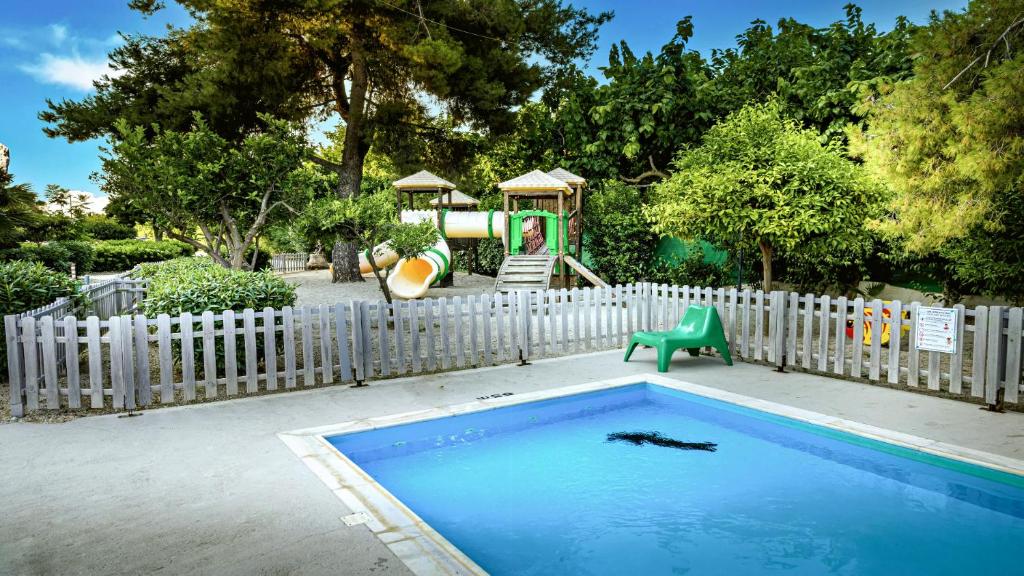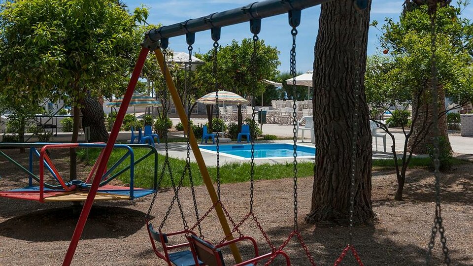 Hotelski sadržaji: Recepcija, restoran, bar kraj bazena, otvoreni bazen, dečji bazen, dečije igralište, tenis ,odbojka na pesku, basket, stoni tenis, parking, iznajmljivanje peškira za plažu.