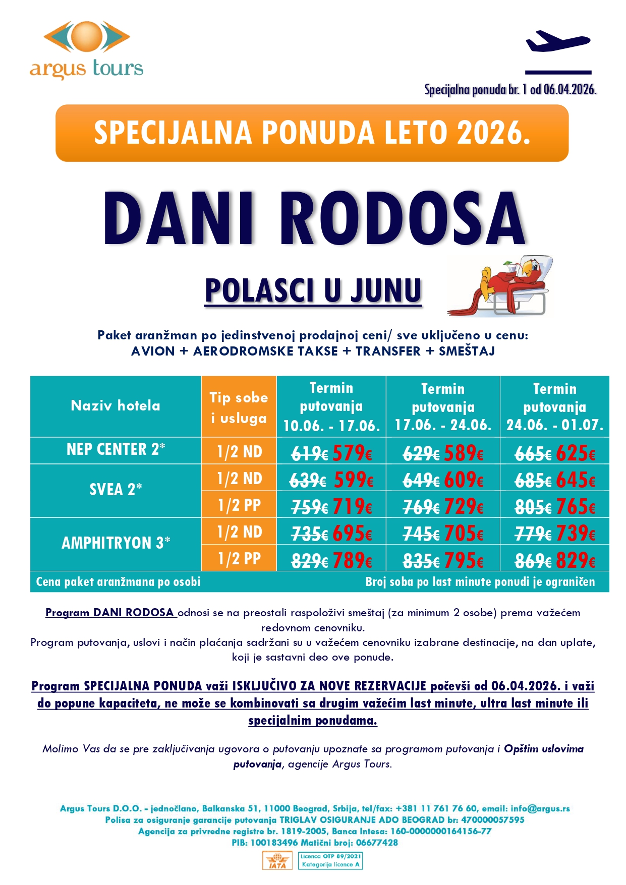 - Avio prevoz - na relaciji Beograd – Rodos – Beograd.