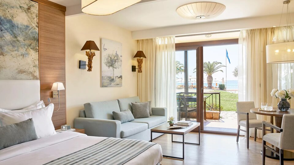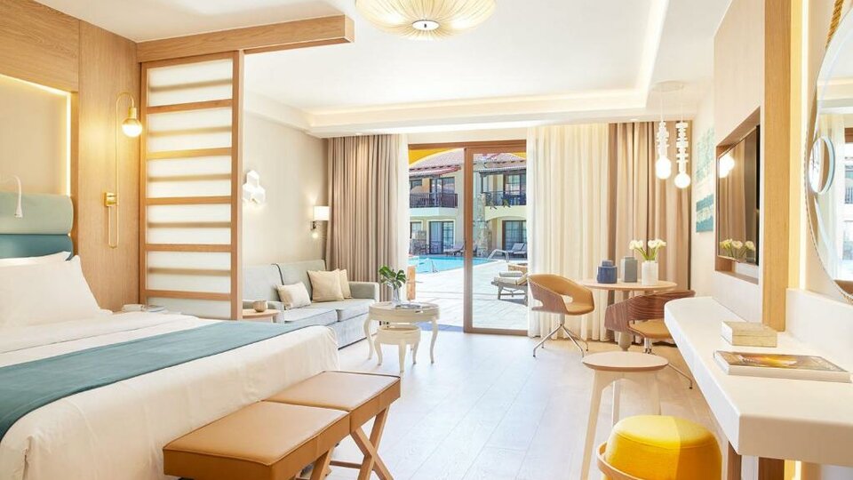 Junioir suite pogled bazen ili more - smeštajne jedinice veličine 32-38m2. Opremljeni su sa francuskim ležajem ili dva osnovna kreveta i sofom .Maksimalni broj osoba u sobi su četiri. Kapacitet sobe: Max 4 osobe ( Odrasli: Max 3 , Deca: Max 2 )