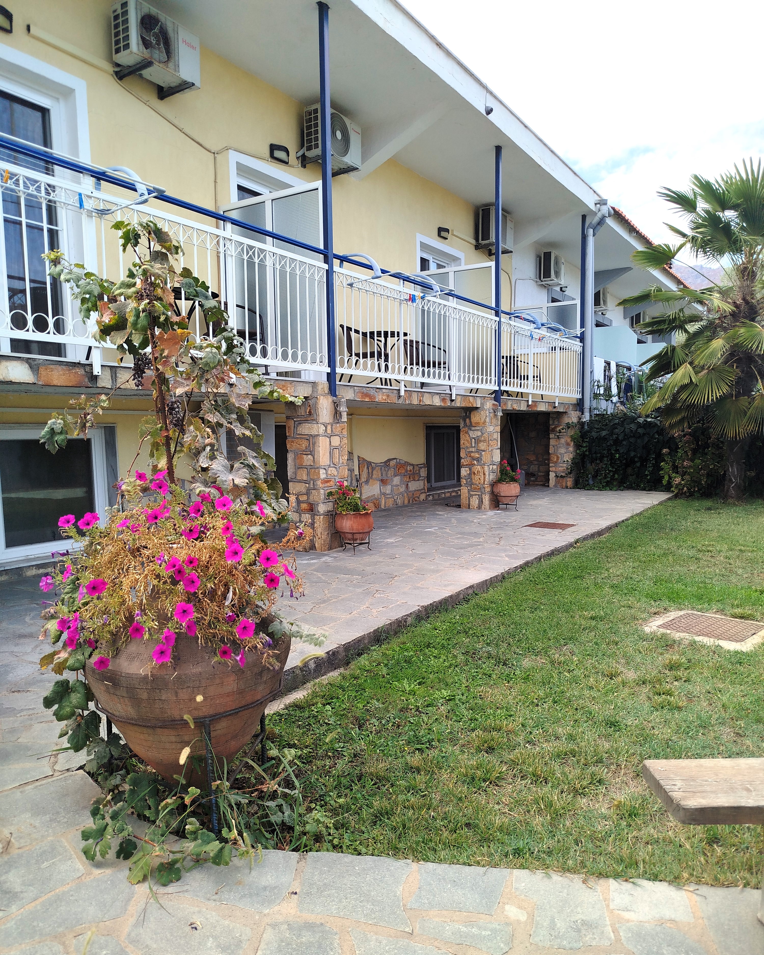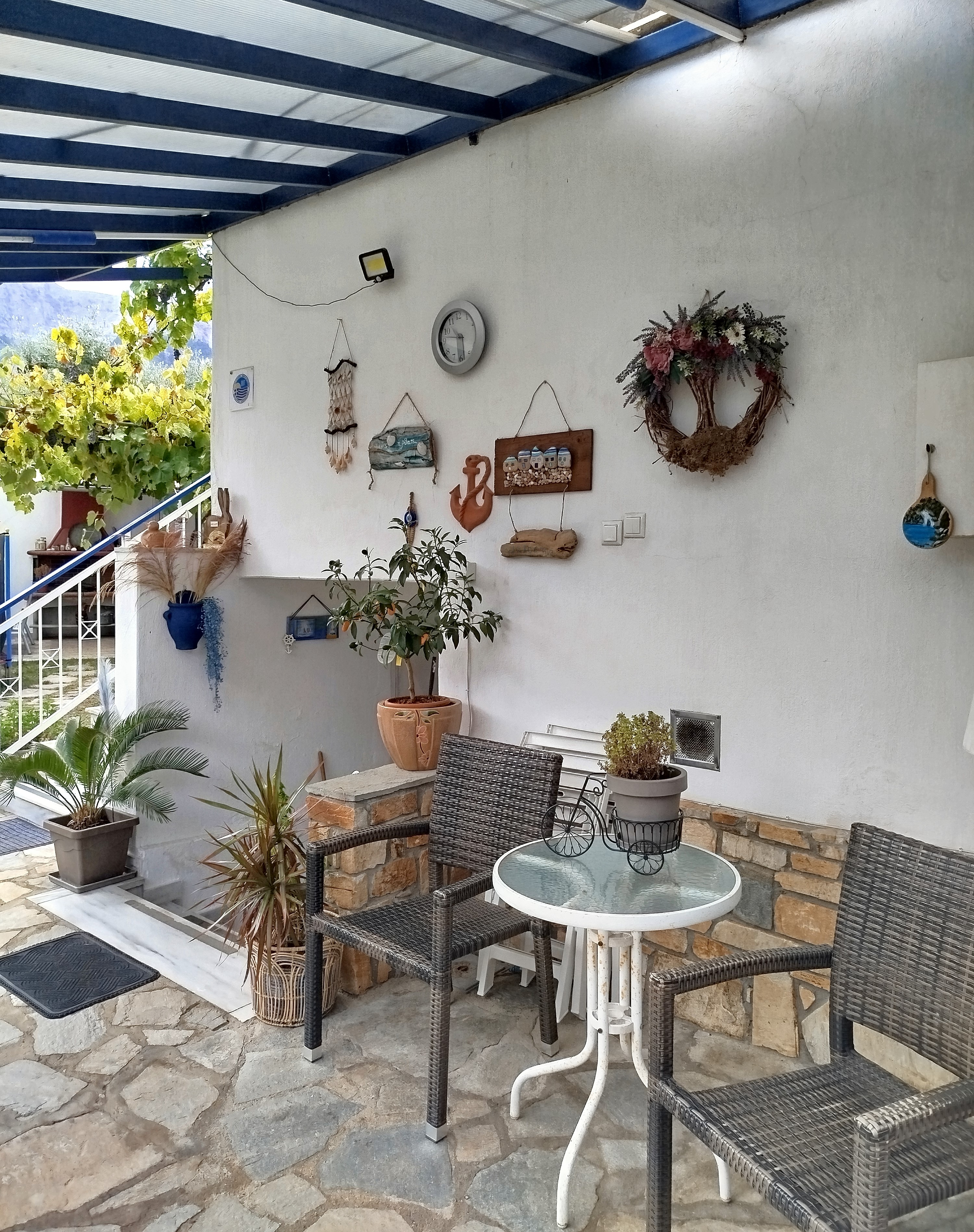 Opis i lokacija: Jednospratna kuća nalazi se na odličnoj lokaciji, na glavnom putu, u mirnom delu Skala Potamije. Od centra, marketa, pekare i plaže udaljena je oko 600 m. U prostranom dvorištu kuće na raspolaganju je garnitura za sedenje, sadržaji za decu i roštilj.