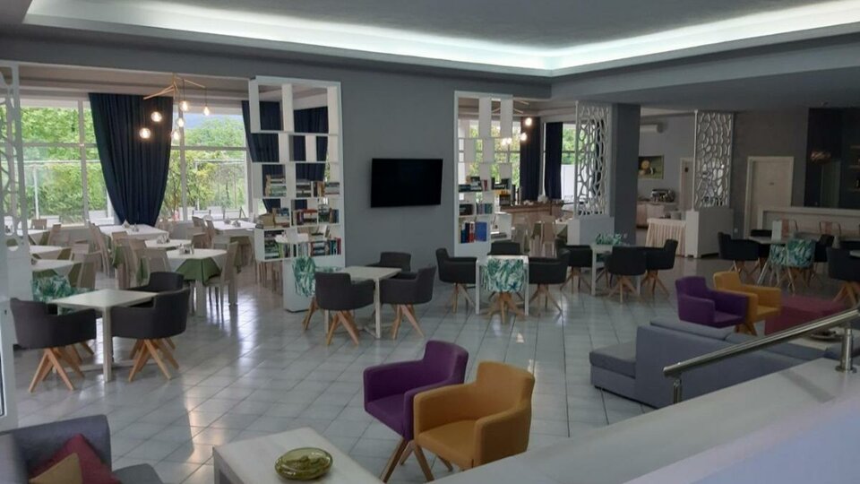 Hotelski sadržaji: Recepcija, bazen, bar pored bazena, restoran, dečije igralište, teniski teren (uz doplatu na licu mesta), parking.