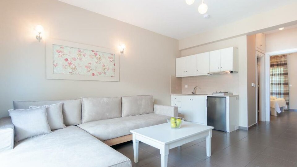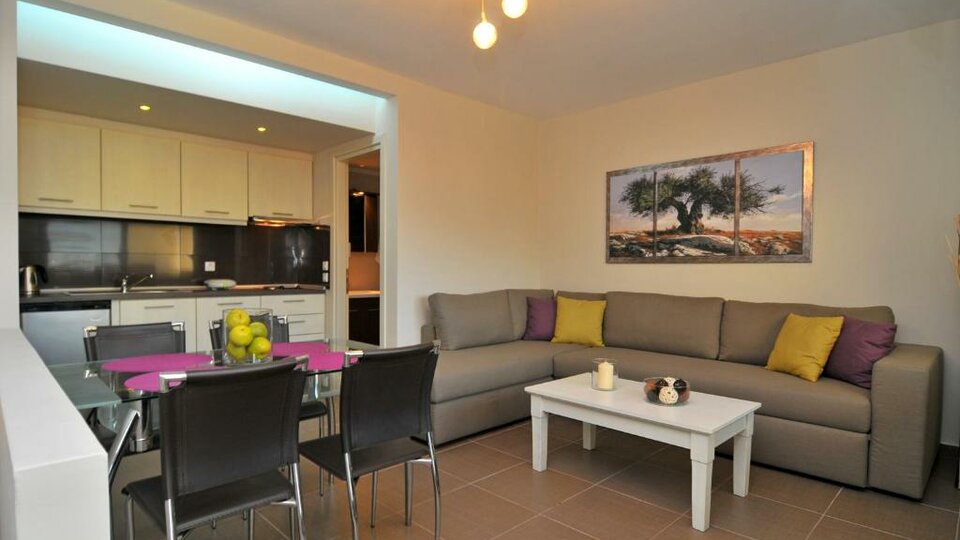 Apartman sa dve spavaće sobe - smeštajne jedinice površine oko 70m², sastoji se iz dve spavaće sobe sa francuskim ležajem ili dva osnovna ležaja i dnevnog boravka sa sofom .Maksimalni broj osoba u sobi je do šest. Kapacitet sobe: Max 6 osobe ( Odrasli: Max 4 , Deca: Max 4)