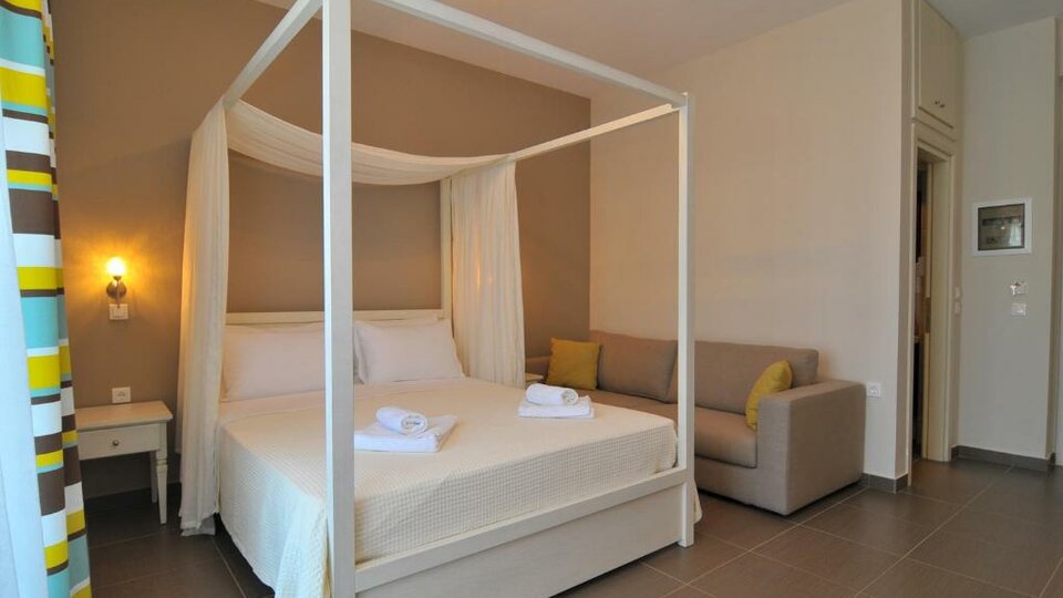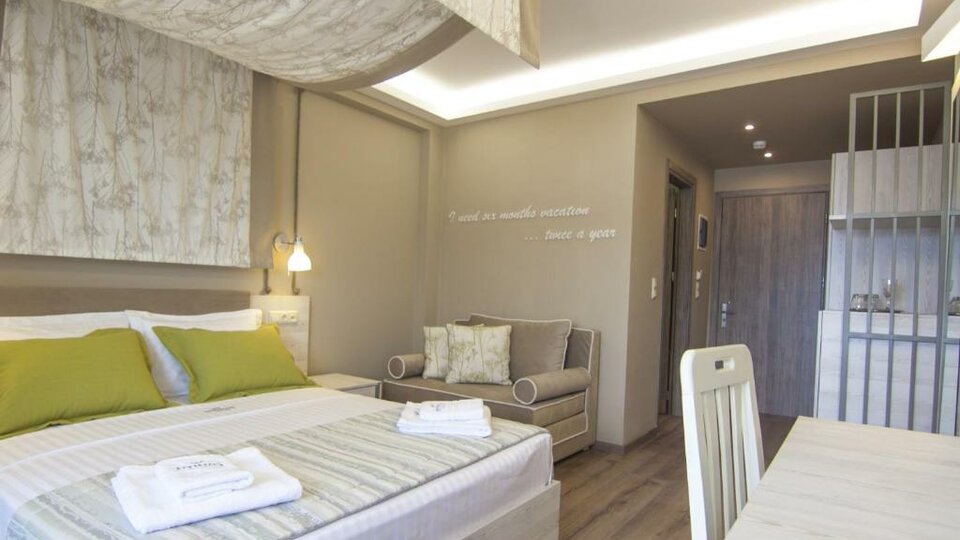 Apartman sa jednom spavaćom sobom - smeštajne jedinice površine oko 45m², sastoji se iz spavaće sobe sa francuskim ležajem ili dva osnovna ležaja i dnevnog boravka sa sofom na razvlačenje. Sofa je namenjena za smeštaj jedne odrasle osobe ili dva deteta uzrasta do 11.99 god. U sklopu ovog tipa smeštajnih jedinica nalazi se i mini čajna kuhinja namenjena za pripremu lakih oborka i napitaka. Maksimalni broj osoba u sobi je do četiri. Kapacitet sobe: Max 4 osobe ( Odrasli: Max 3 , Deca: Max 2)