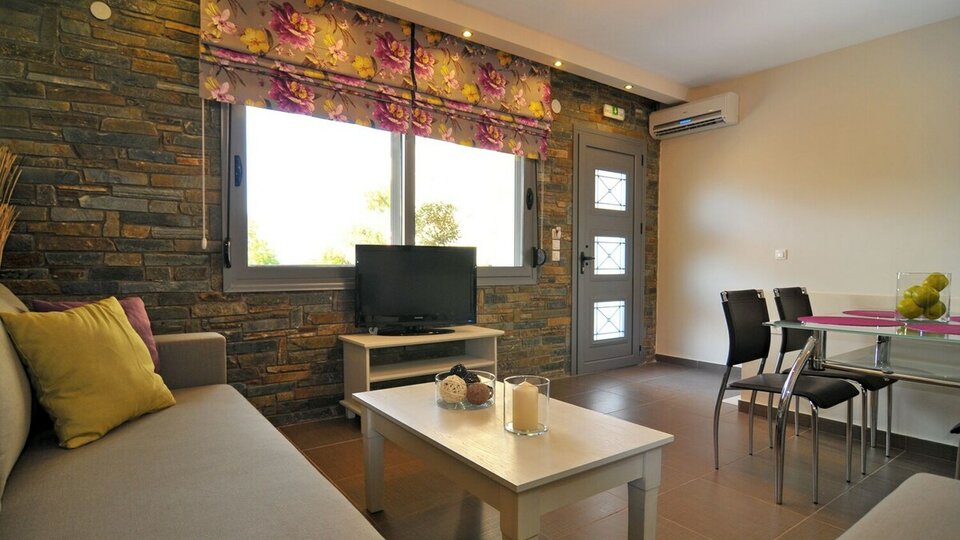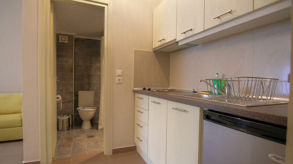 Apartman na dva nivoa - Apartmani veličine oko 55m2 imaju dva nivoa i mogu da prime do 4 osobe.Na gornjem nivou se nalazi dnevni boravak i kuhinja, kupatilo i veranda. Postoji veliki kauč na razvlačenje koji može da primi 2 osobe. Na donjem nivou nalazi se glavna spavaća soba sa bračnim krevetom, kadom za 2 osobe u sobi i drugo kupatilo. Kapacitet sobe: Max 4 osobe ( Odrasli: Max 3 , Deca: Max 2)