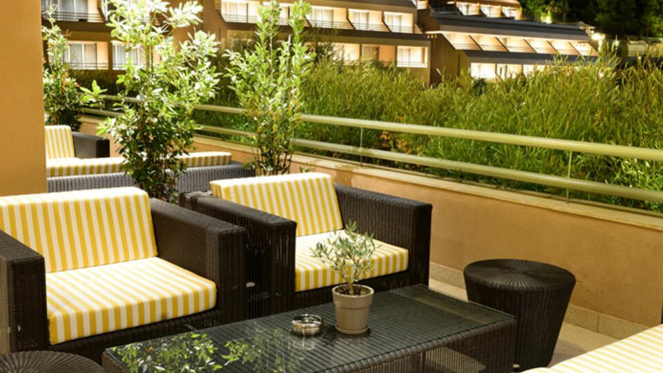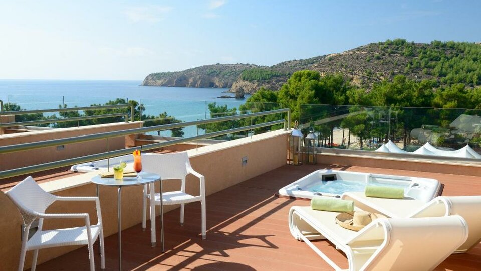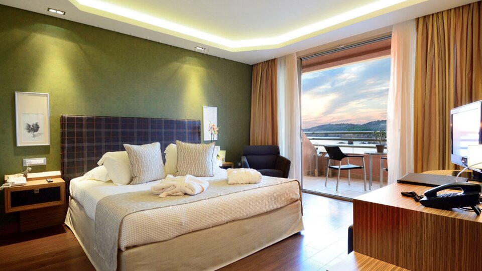 Executive soba pogled more - smeštajne jedinice površine oko 28 m², sa francuskim ležajem ili dva osnovna ležaja. Maksimalni broj osoba u sobi su dve. Iz ovog tipa smeštajnih jedinica pruža se pogled na more a terase su opremljene ležaljkama i suncobranom.