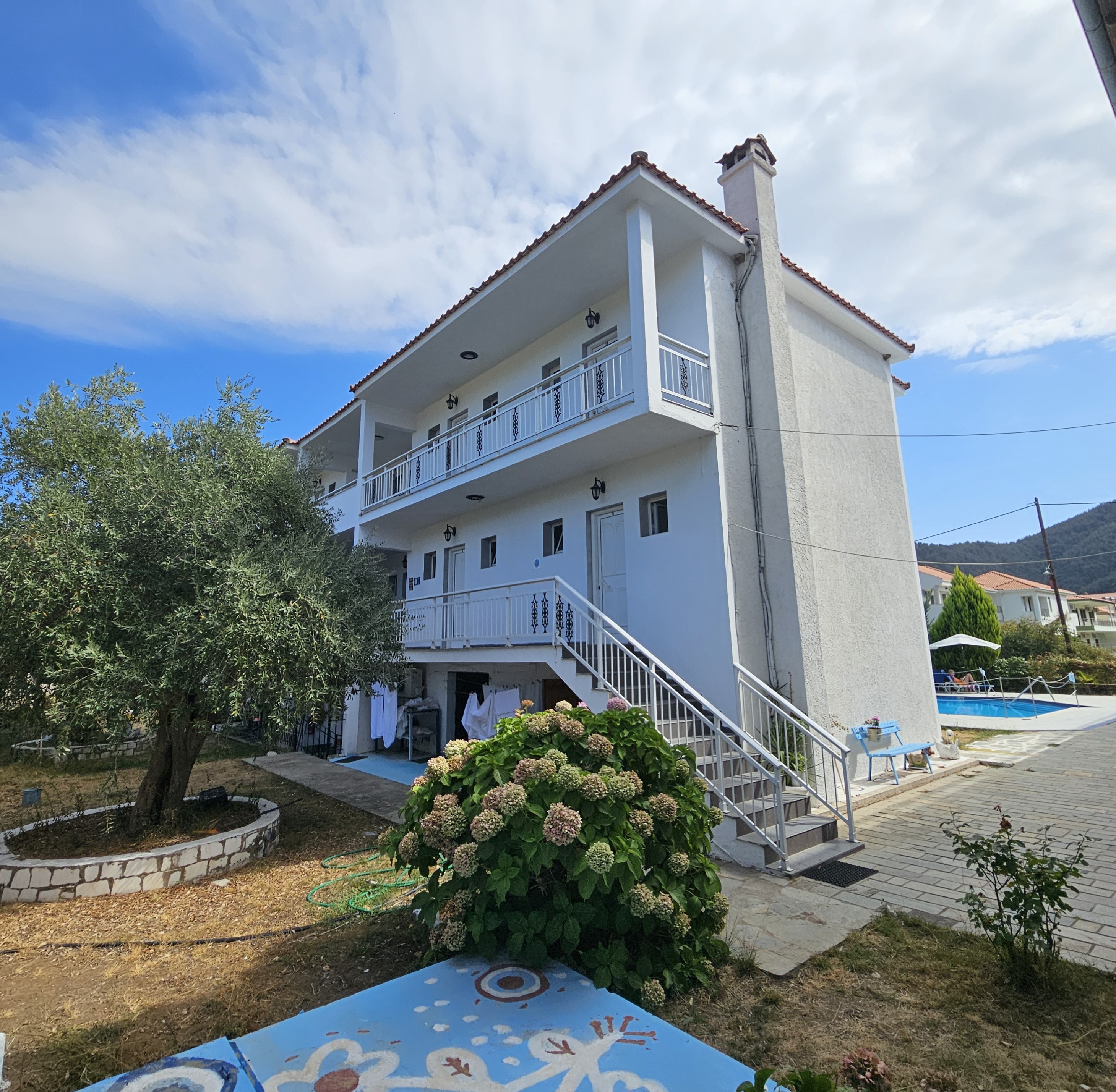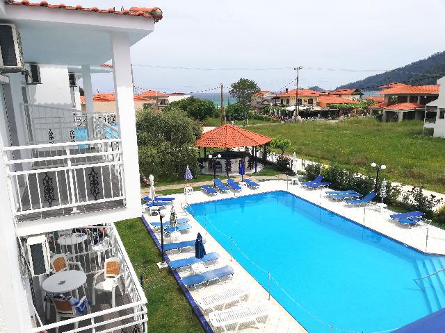 Opis i lokacija: Jednospratni kompleks sa visokim prizemljem koji čine dve zgrade. Nalazi se u mirnom delu i širem centru Skala Potamije, ispod glavne magistrale. U sklopu kompleksa nalazi se bazen i bar.