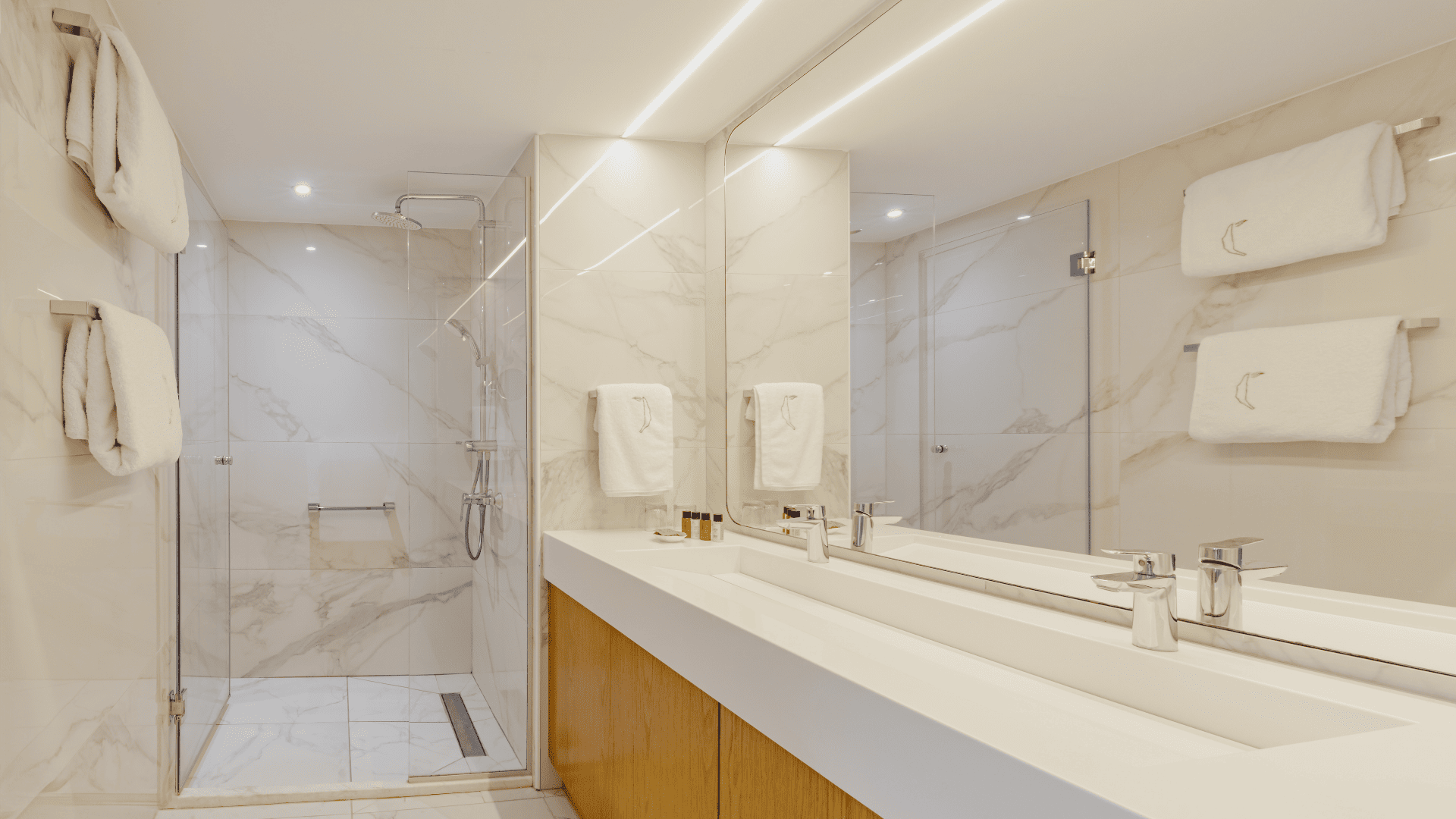 Mini Suite SSV su površine oko 32m2, dvokrevetne sa francuskim ležajem i sofom na rasklapanje za smeštaj odrasle osobe ili deteta do 12 godina. Imaju bočni pogled na more (Side Sea View) i privatan đakuzi na terasi. Mogu smestiti maximum 3 osobe.
