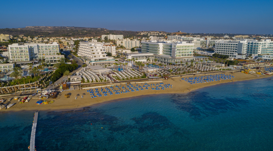 Constantinous The Great Beach Hotel 5* se nalazi na peščanoj plaži Vrissiana, od koje ga deli štelište. Nalazi se u centralnom delu Protarasa, dok je čuvena plaža i zaliv Fig Tree je udaljena oko 15 minuta hoda. Hotel pripada lancu Tsokkos hotela.