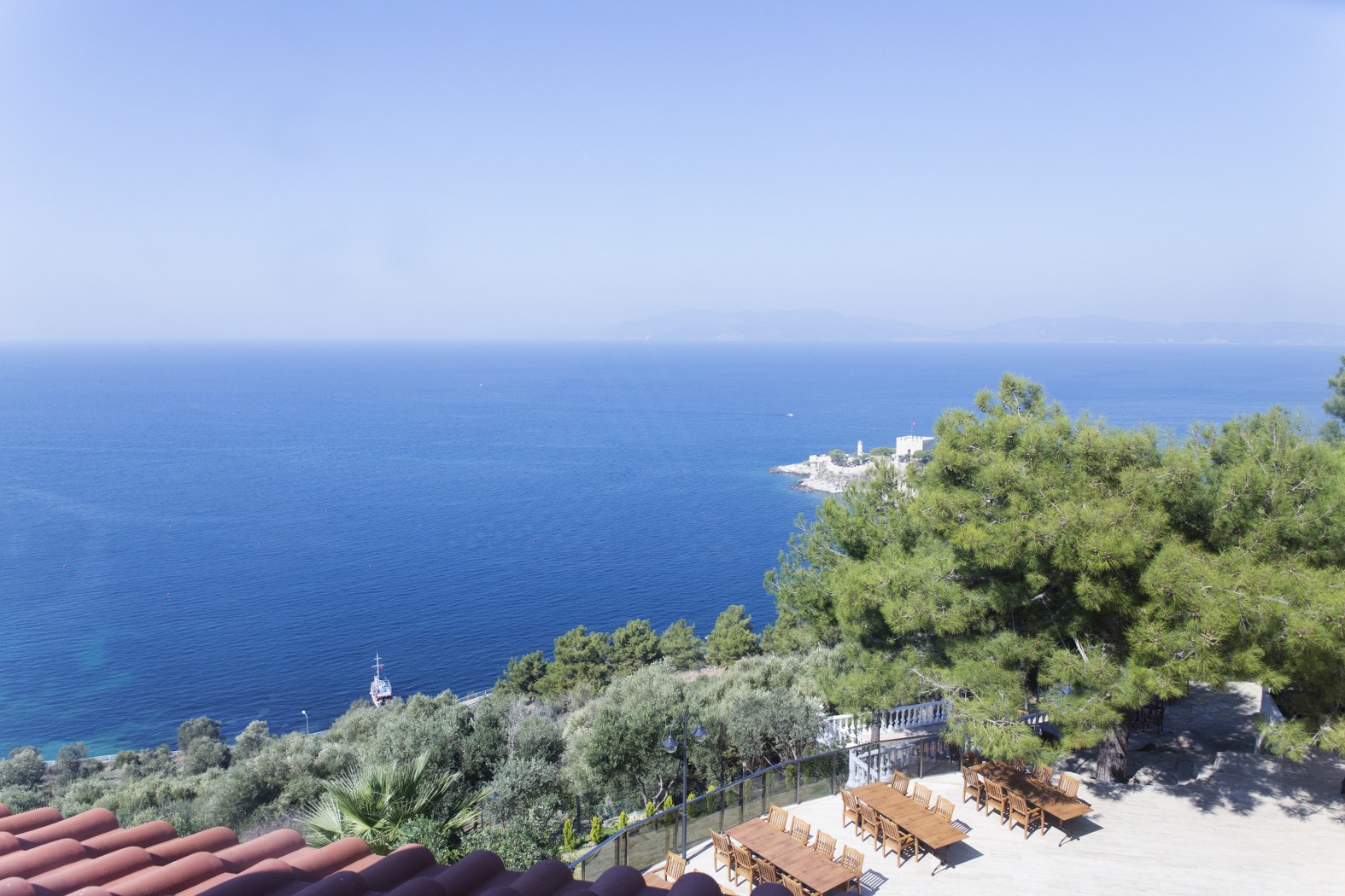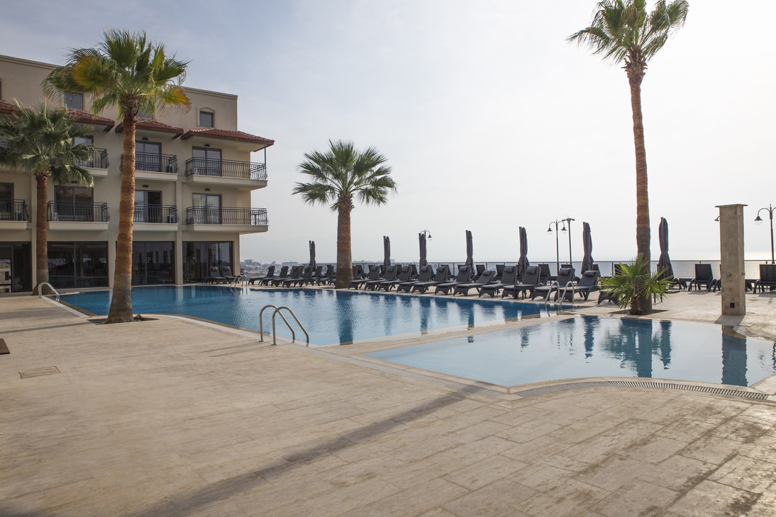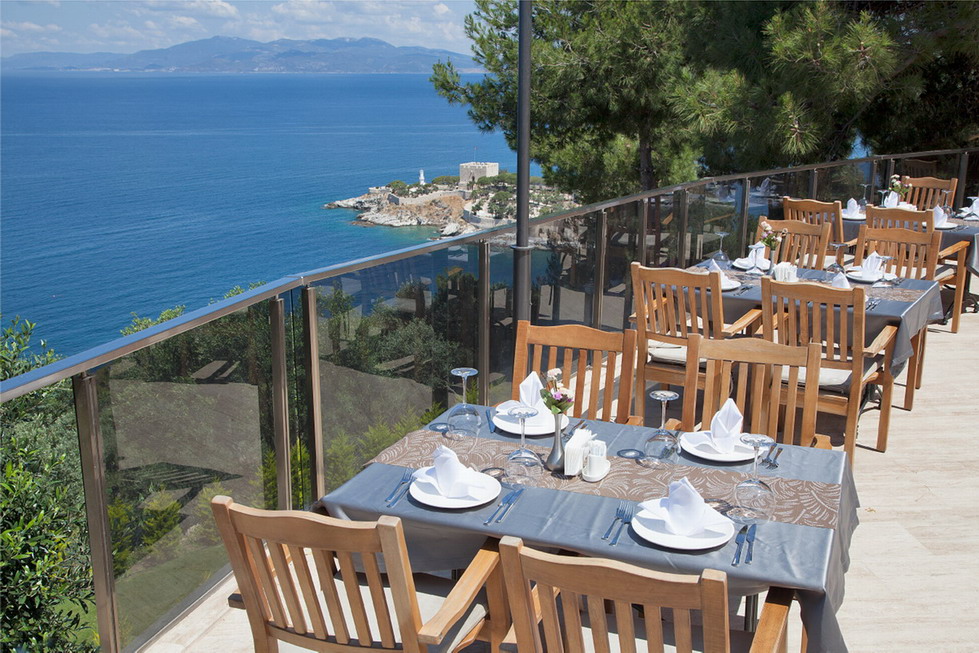 Lokacija: Hotelski kompleks moderno dizajniran i smešten između bujnog zelenila borovog i palminog drveća na uzvišenju, odakle se pruža pogled na Egejsko more. Nalazi se na oko 1.5 km od centralnog dela Kušadasija.