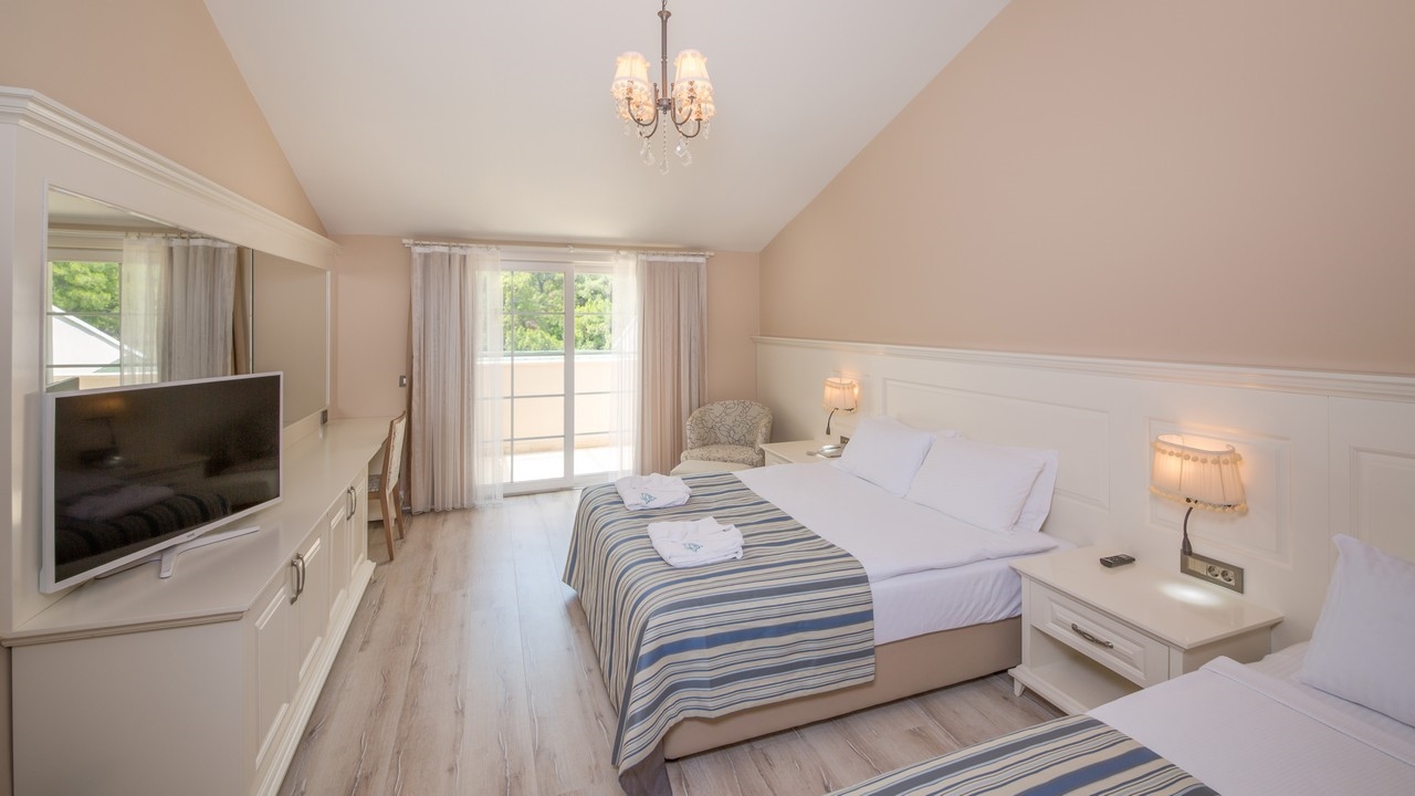 Smeštaj: Standardne sobe – dvokrevetne ili dvokrevetne sa pomoćnim ležajem, opremljene TWC-om, fenom, TV-om, telefonom, mini barom (dodatno se plaća, besplatna je samo voda na dan dolaska), sefom (dodatno se plaća), klima uredjajem i balkonom. Family sobe su predvidjene za smeštaj minimum 2 odrasle osobe, a maksimum 4 osobe (dve odrasle osobe i dvoje dece uzrasta do 12,99,godina ili 3 odrasle osobe i jedno dete uzrasta do 12,99 ), strukture francuski ležaj, osnovni ležaj i pomoćni ležaj na rasklapanje, opremljene kao i standardne sobe.